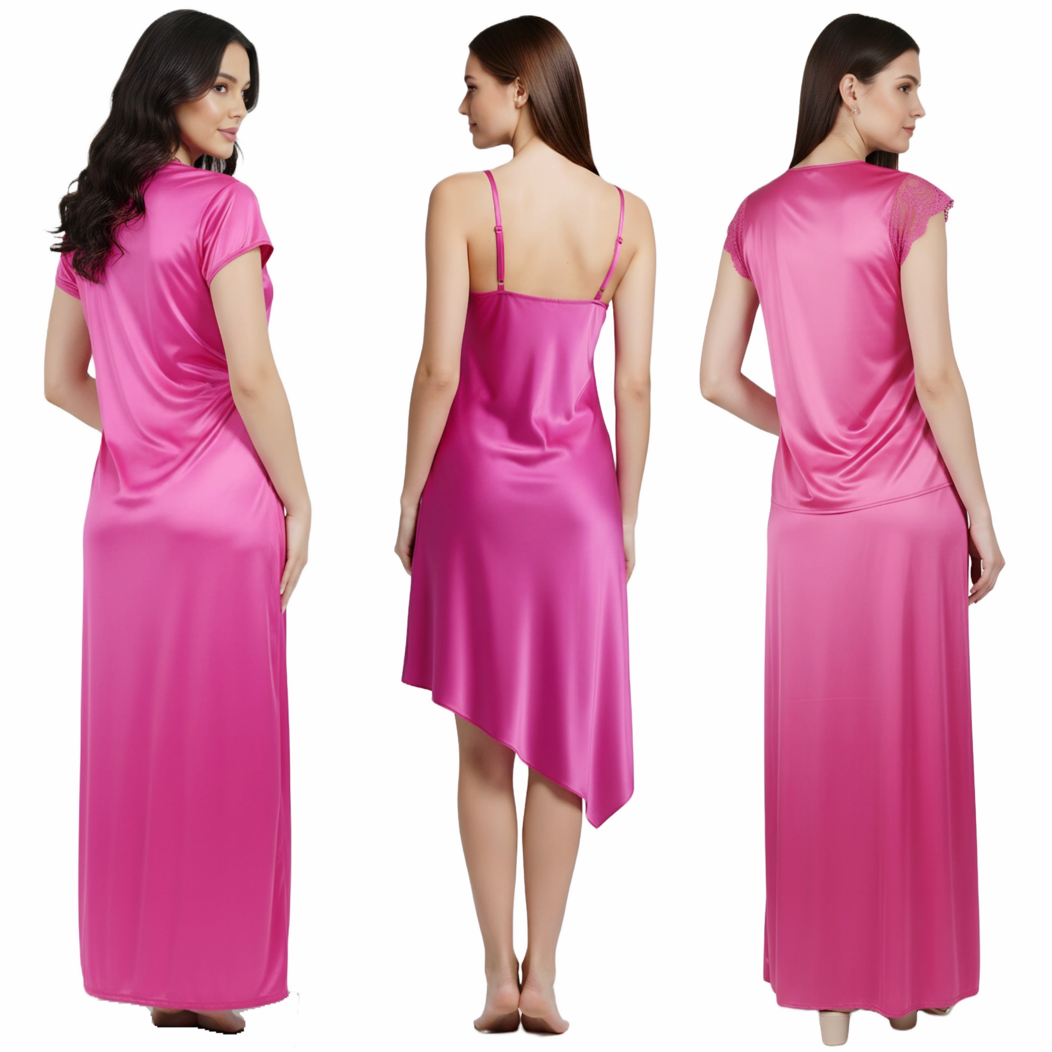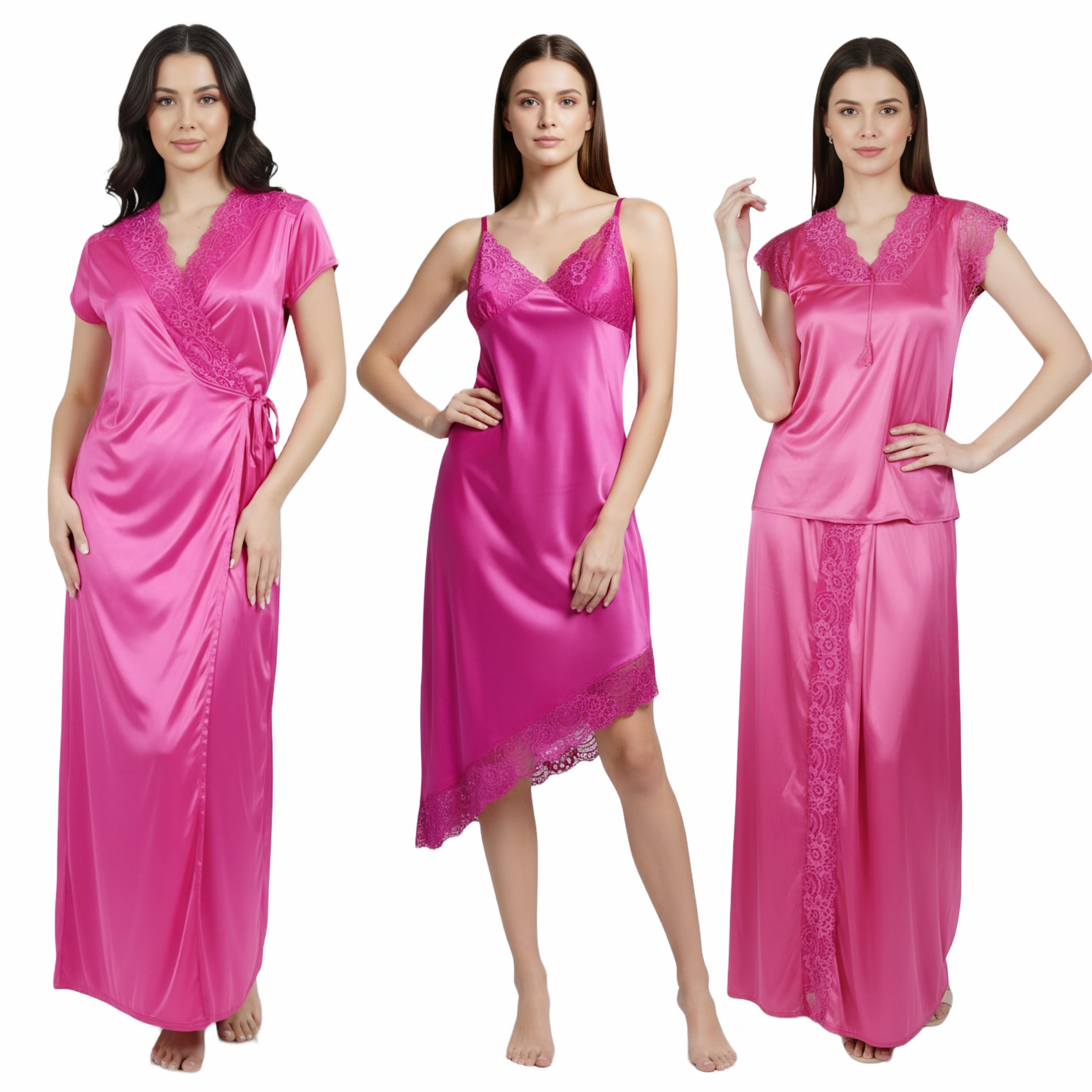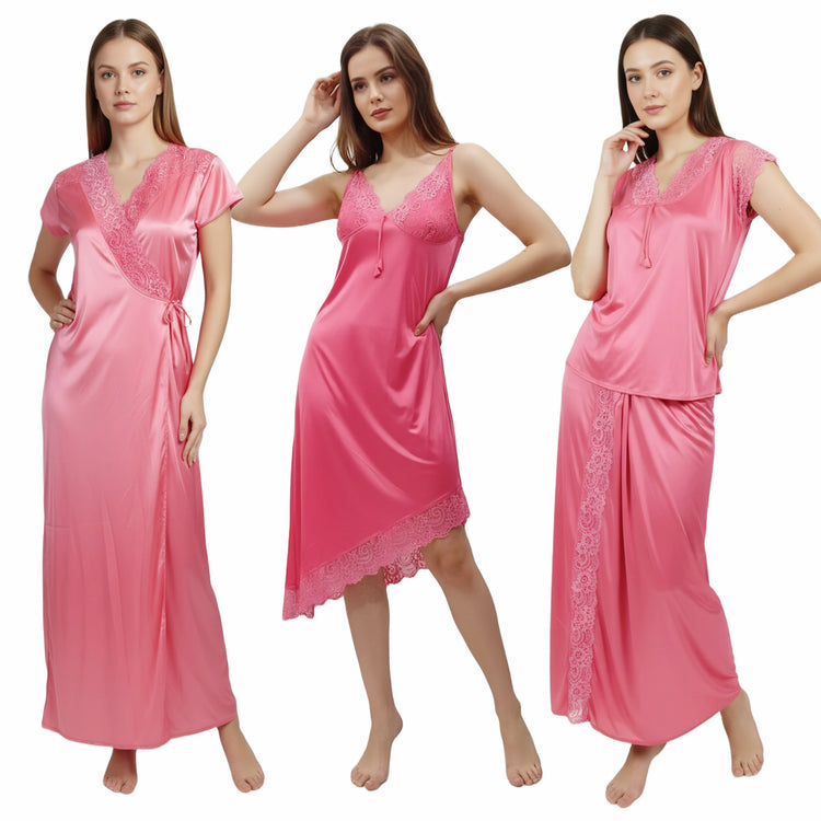 Fancy Bedroom 4pc Nighty with Robe for Women | Premium Satin Designer NightwearSoft & Comfortable Fit | V- Neck | Attractive & Stylish (113706 NIGHTY COMFORT)