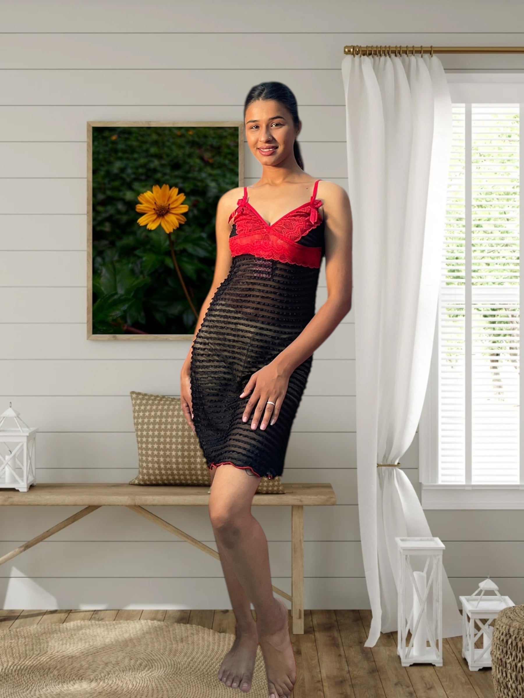 RED ROSE WOMEN LACE N MASH BABYDOLL NIGHTY WITH THONG