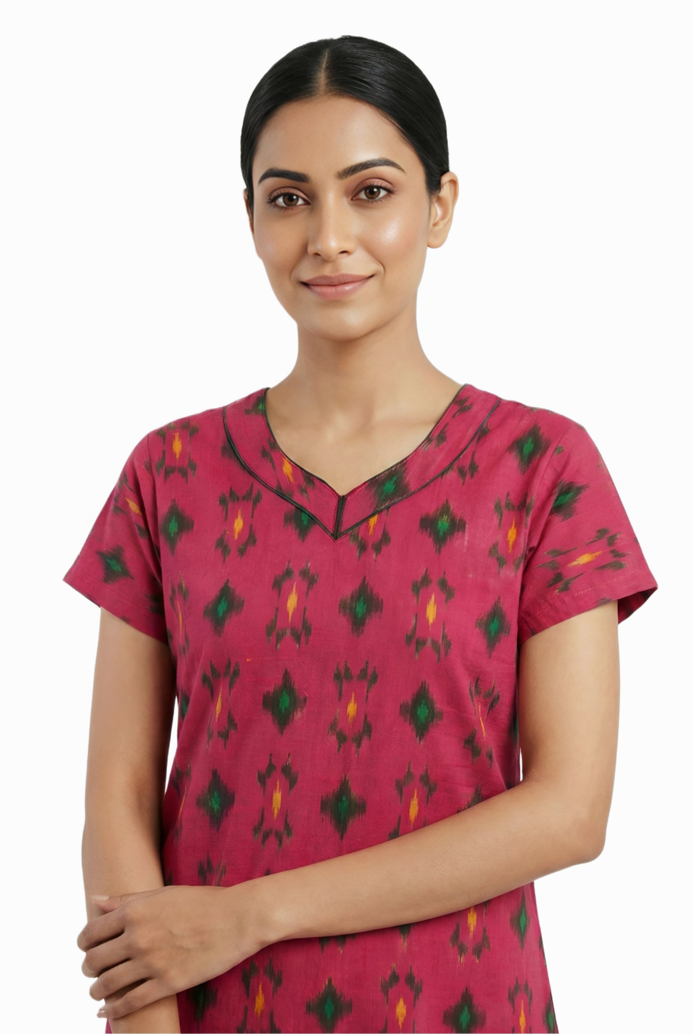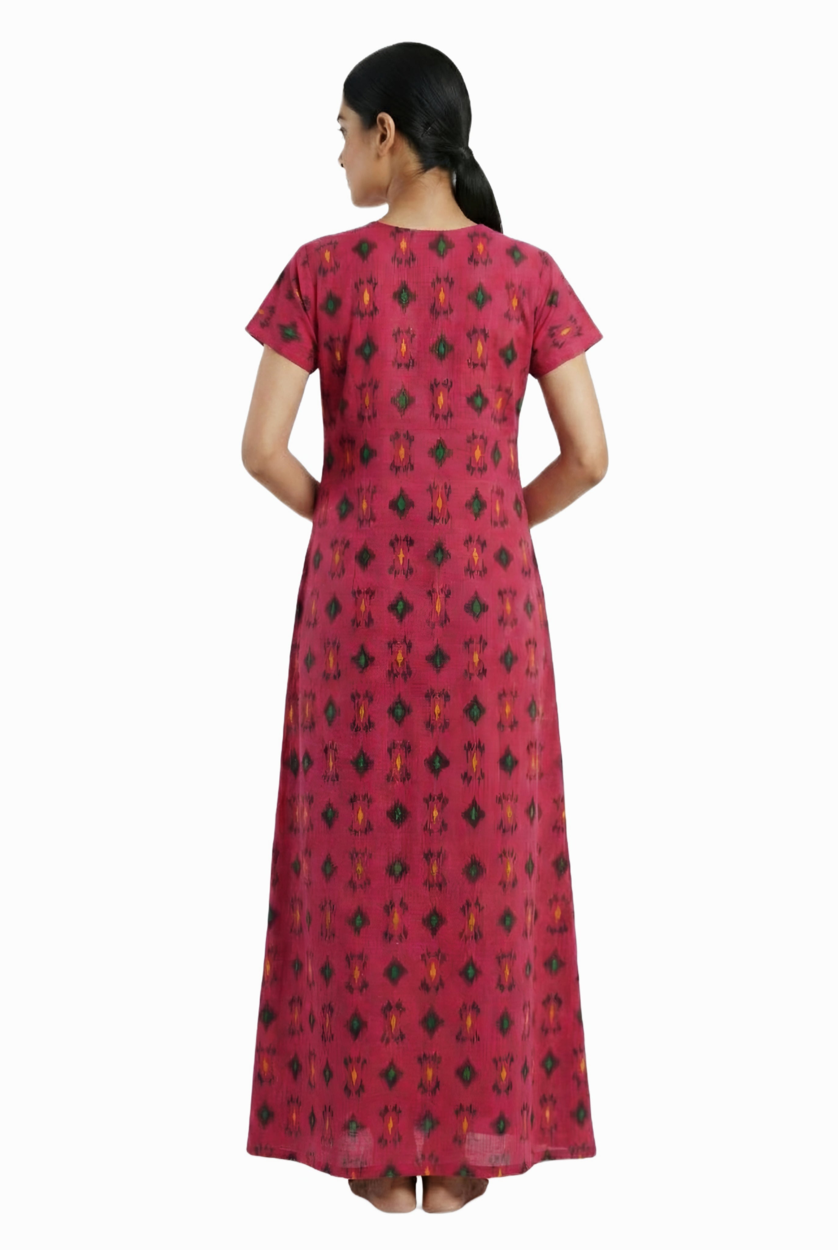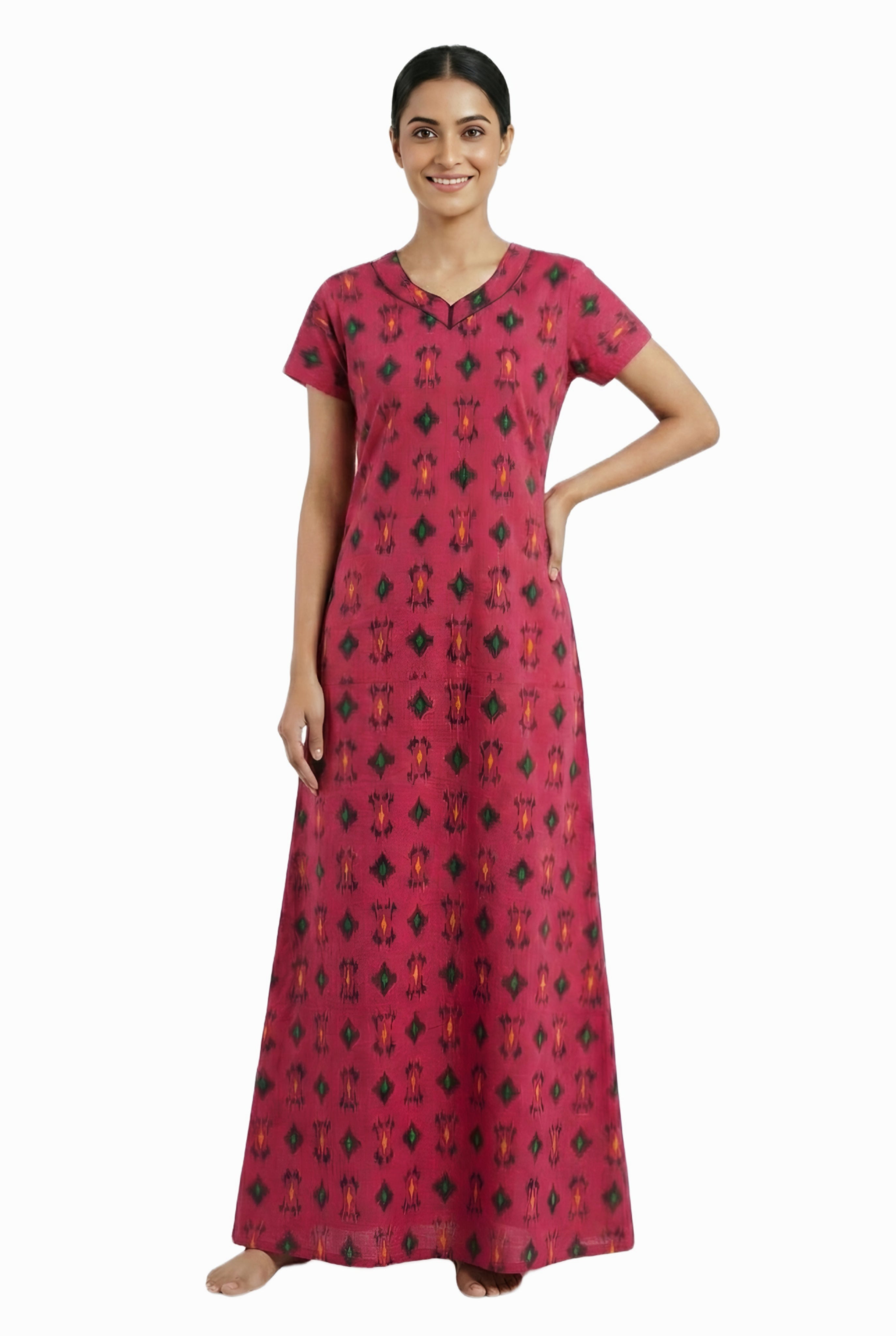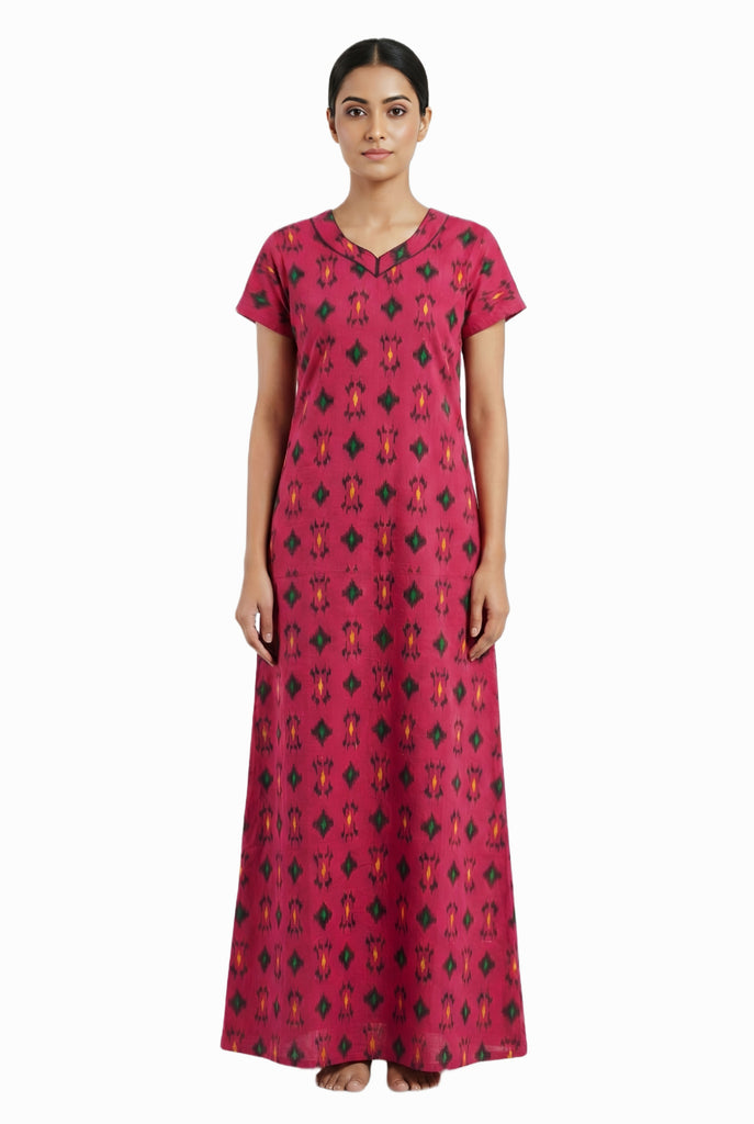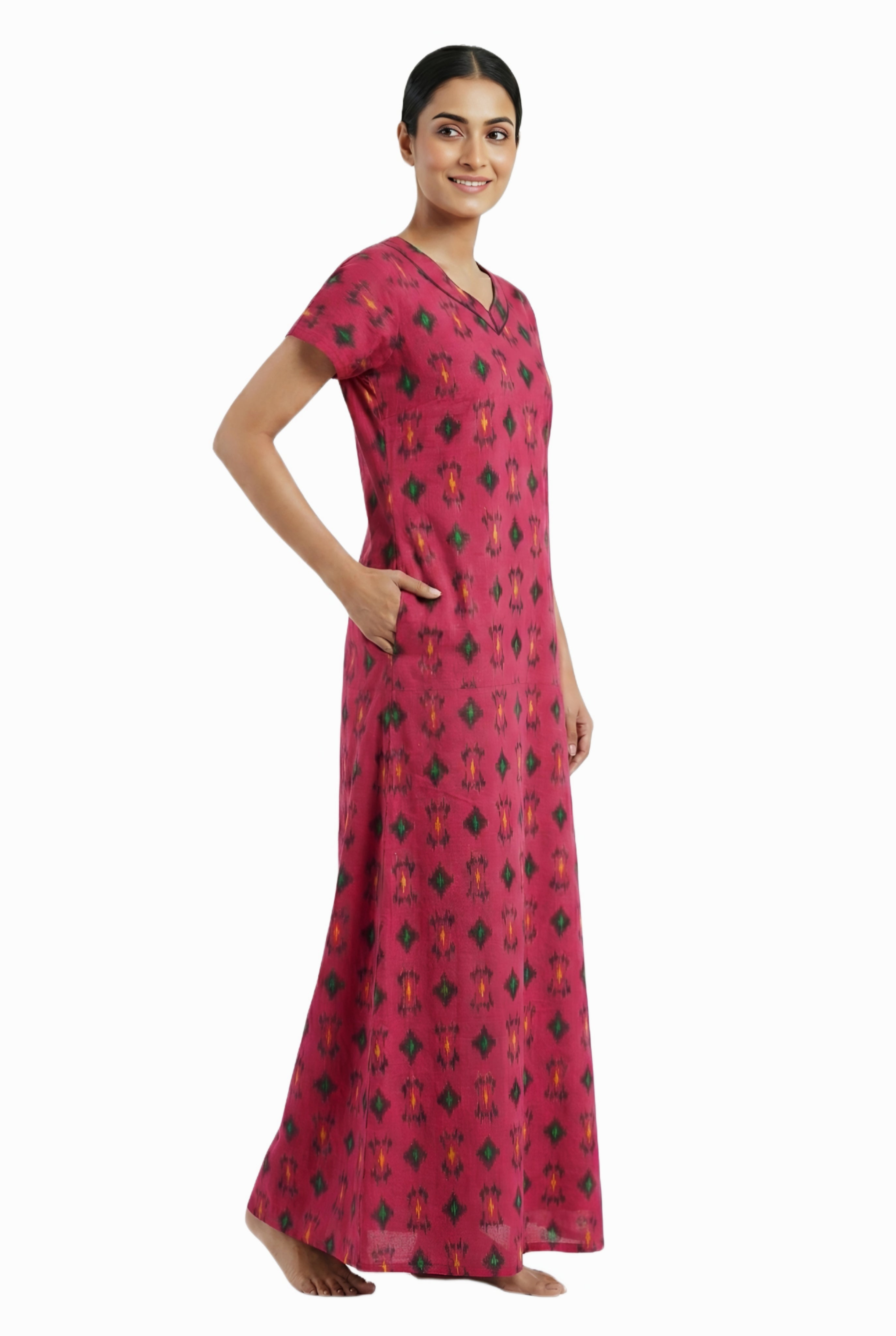 | The elegant V-neck design with neat contrast piping gives a modern and flattering look, while the front pleats add beautiful fall and shape. Featuring side pockets for convenience and a smooth A-line flow, this gown is perfect for home, leisure, and night wear. |