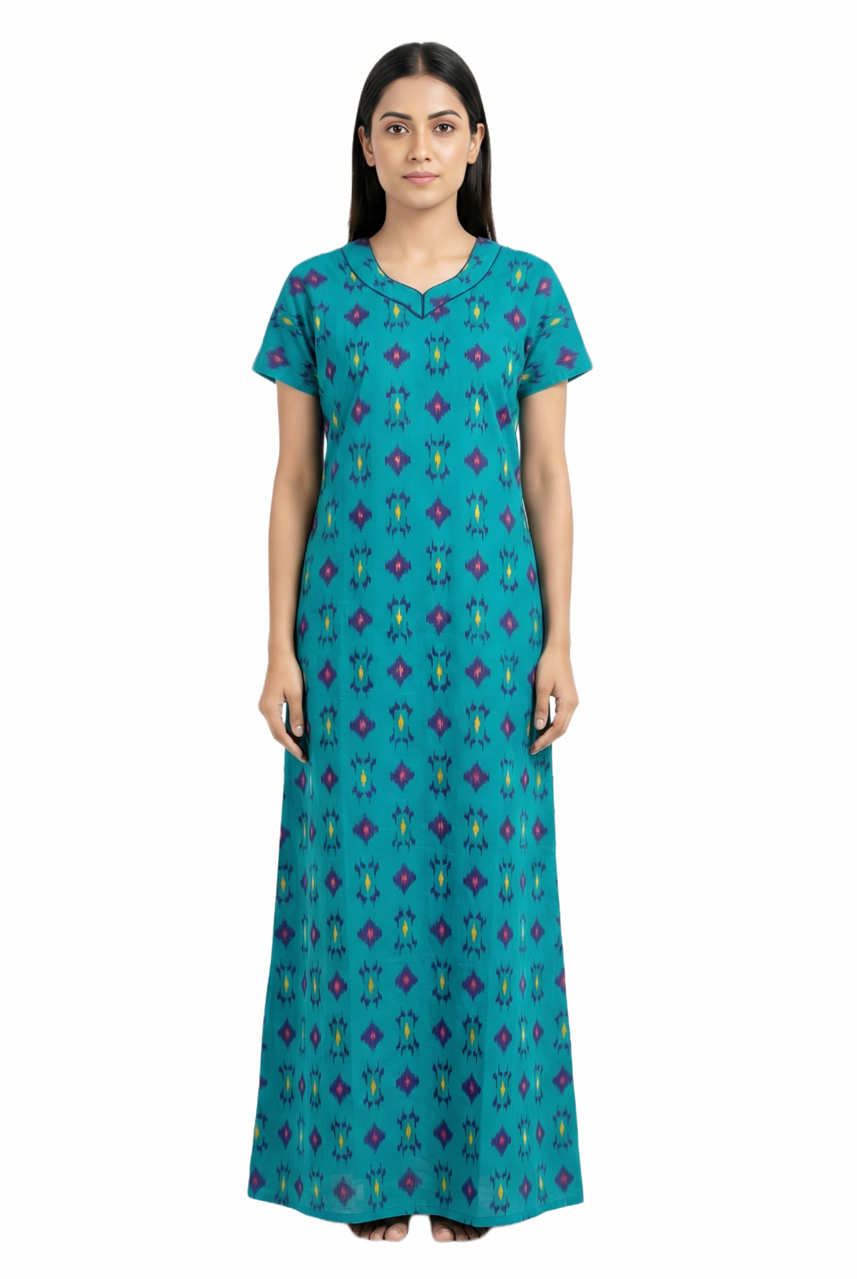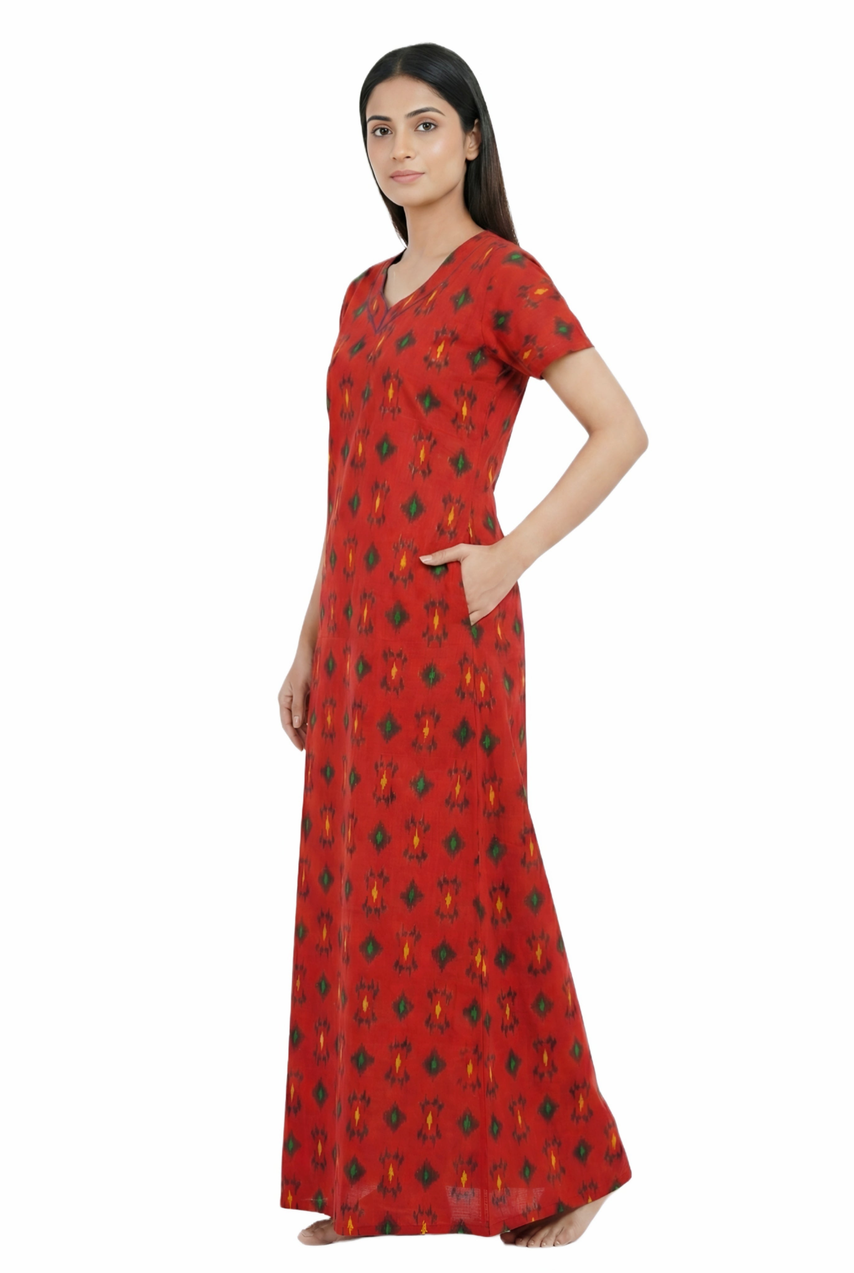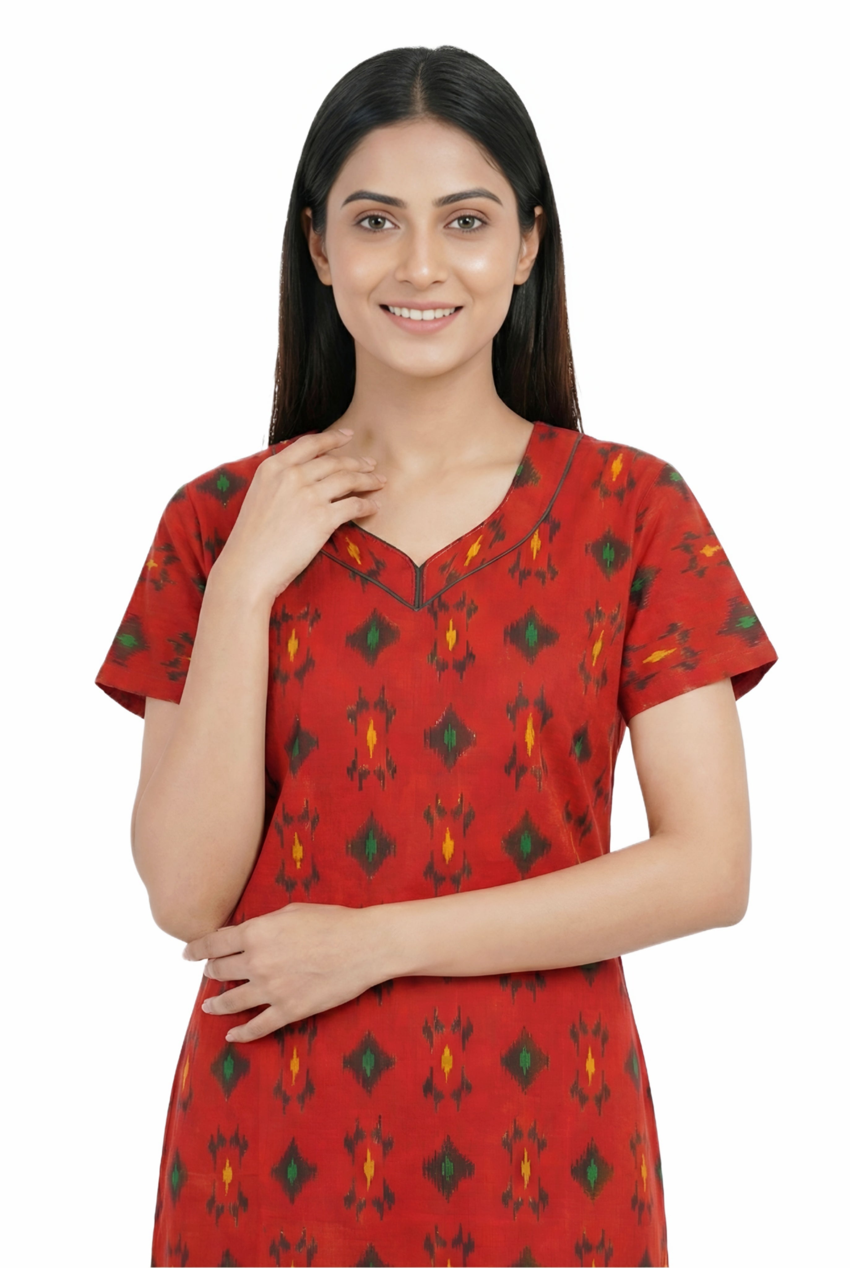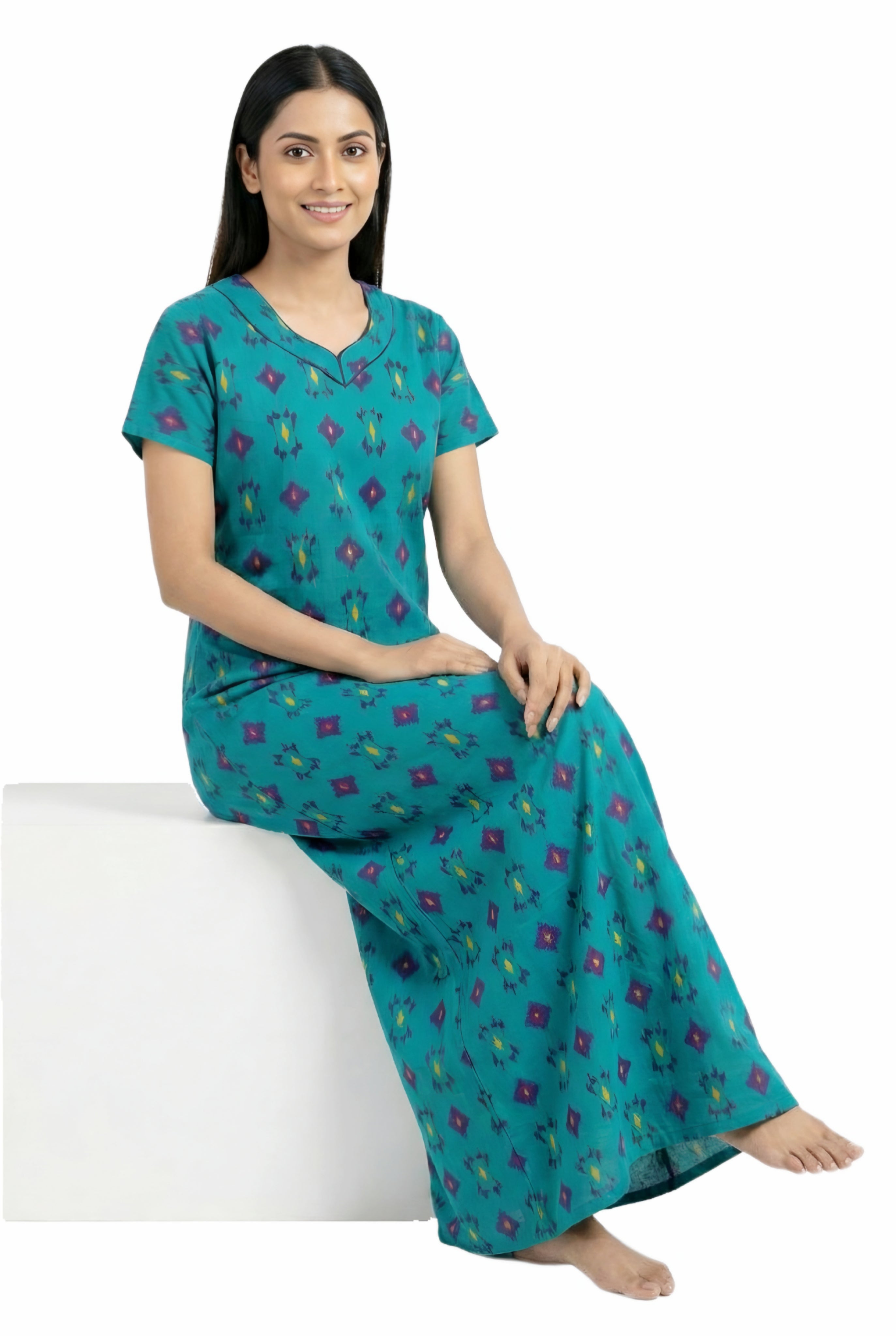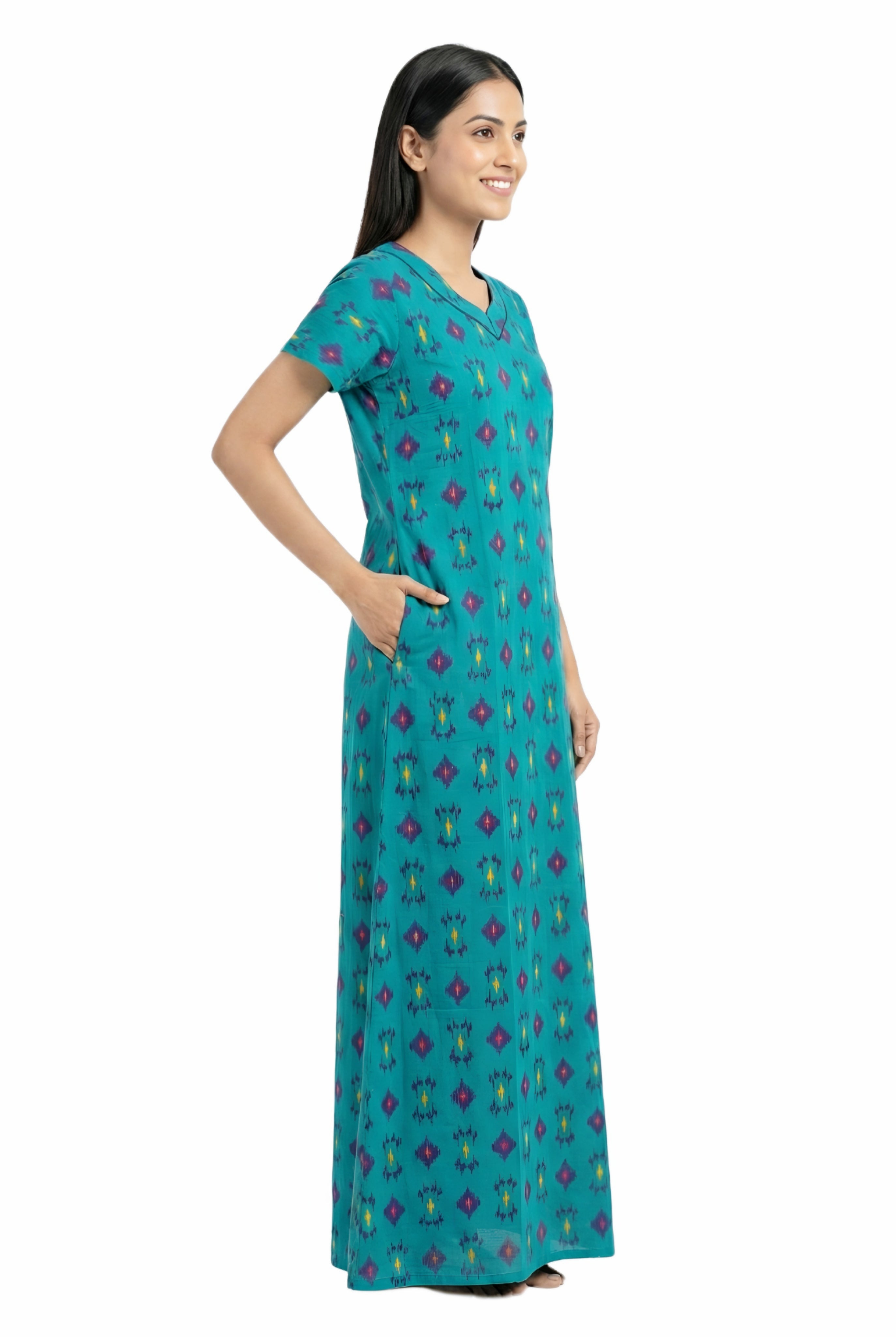 | The elegant V-neck design with neat contrast piping gives a modern and flattering look, while the front pleats add beautiful fall and shape. Featuring side pockets for convenience and a smooth A-line flow, this gown is perfect for home, leisure, and night wear. |