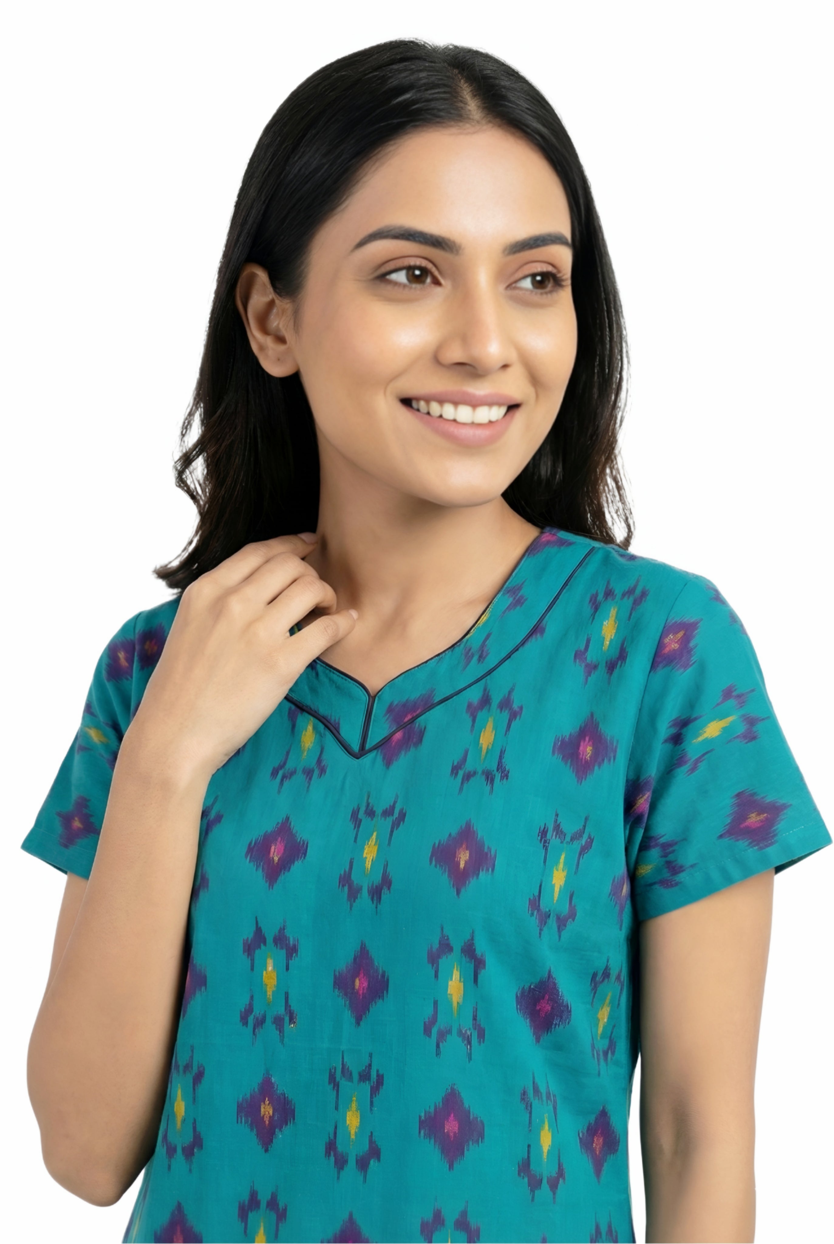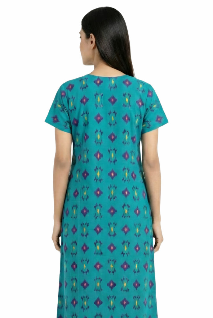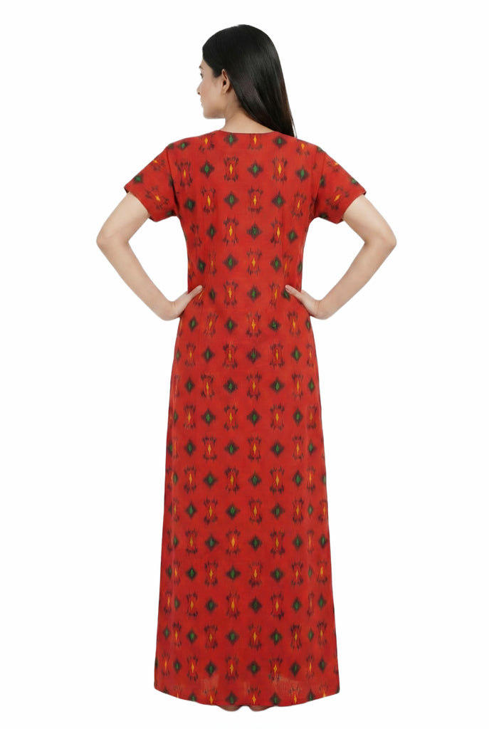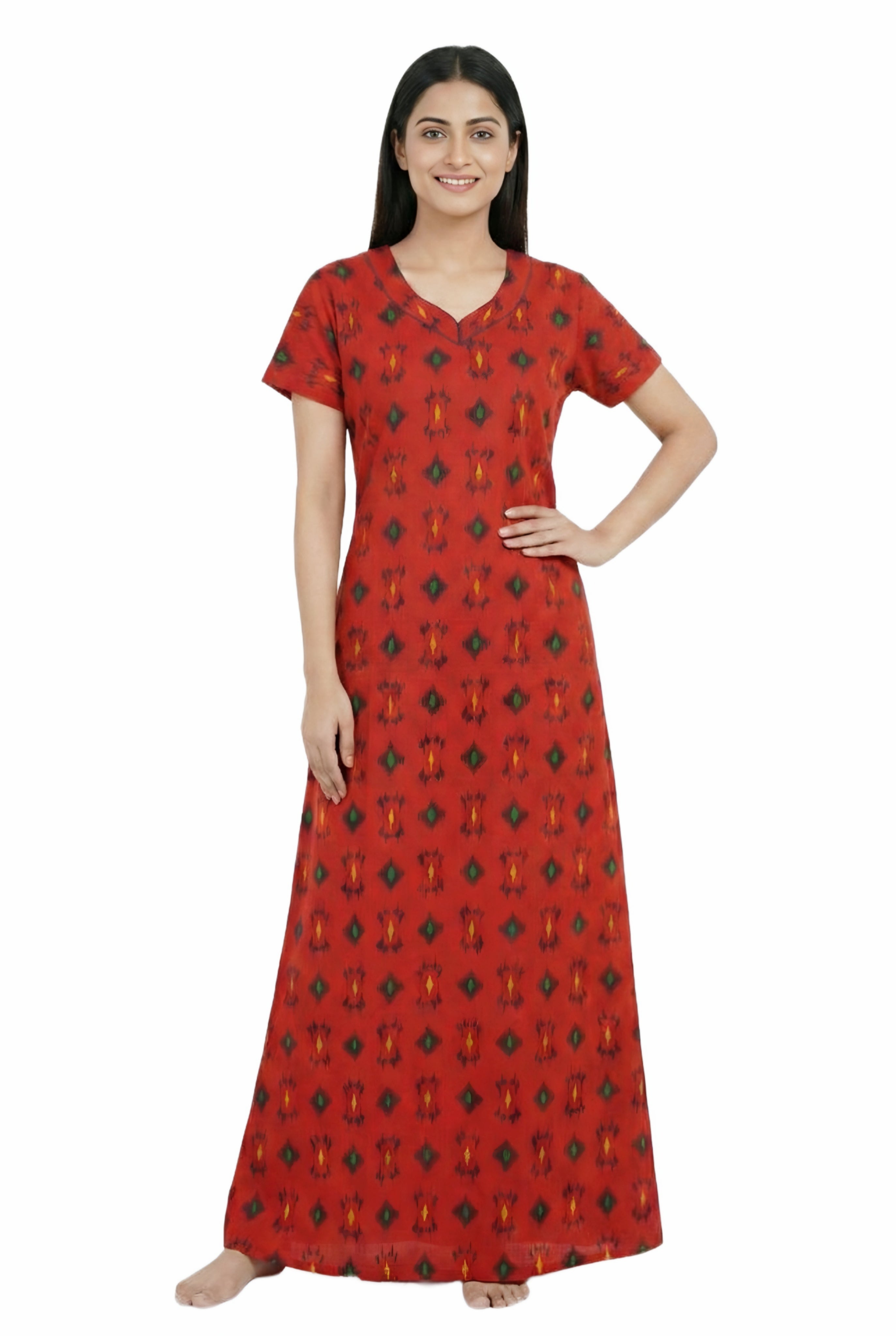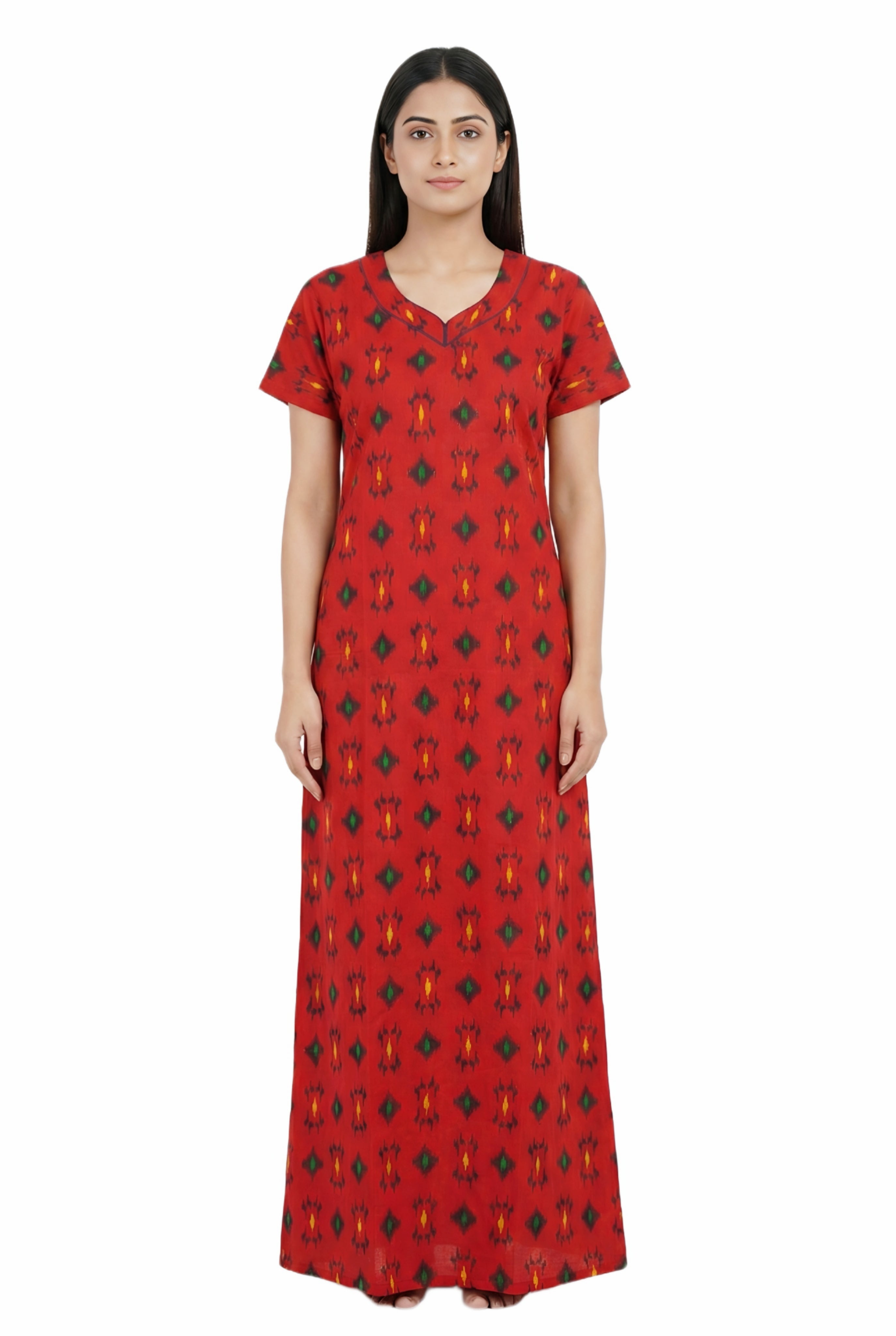 | The elegant V-neck design with neat contrast piping gives a modern and flattering look, while the front pleats add beautiful fall and shape. Featuring side pockets for convenience and a smooth A-line flow, this gown is perfect for home, leisure, and night wear. |