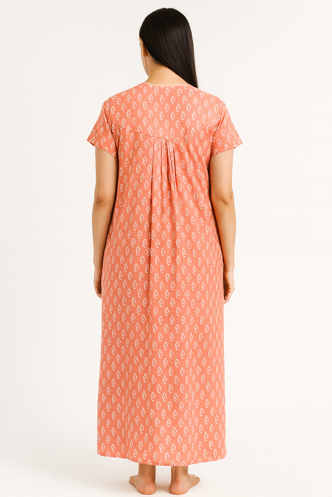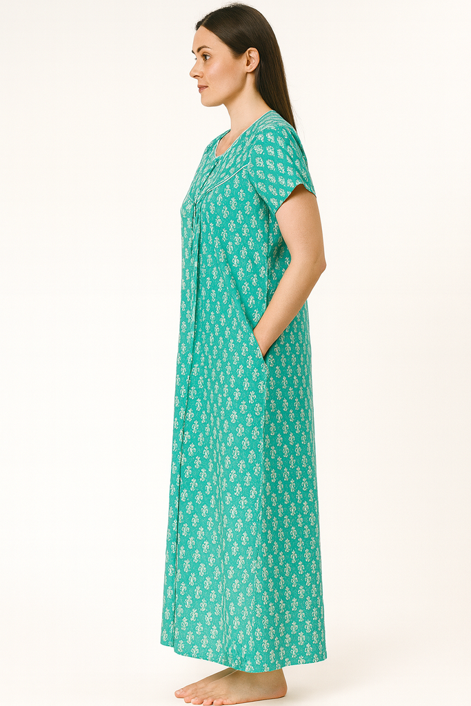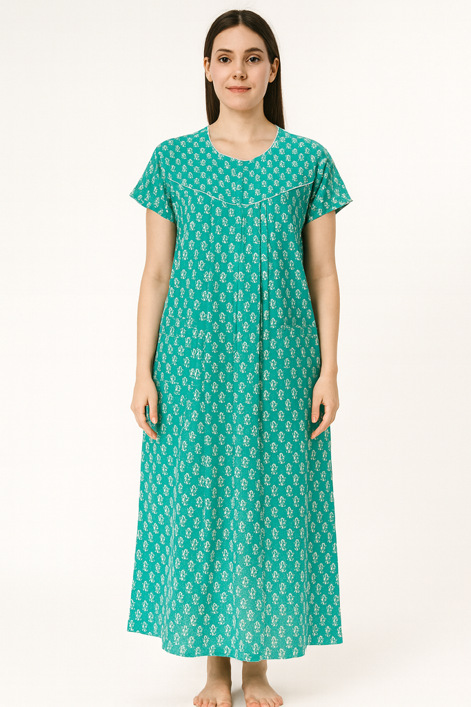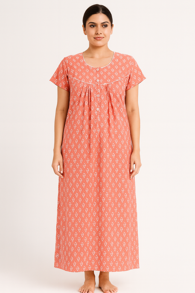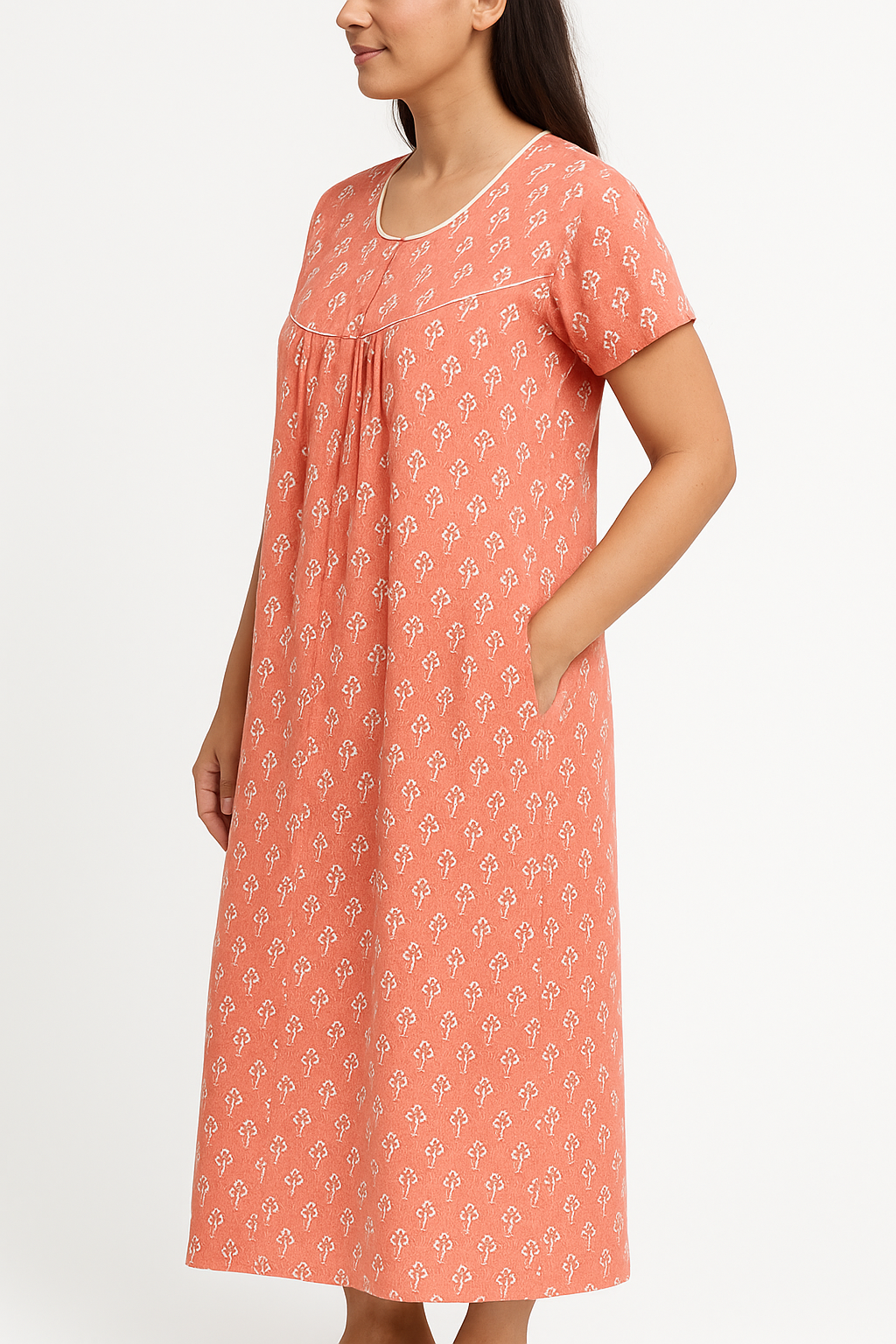 | The elegant U-neck design with neat contrast piping gives a modern and flattering look, while the front pleats add beautiful fall and shape. Featuring side pockets for convenience and a smooth A-line flow, this gown is perfect for home, leisure, and night wear. |