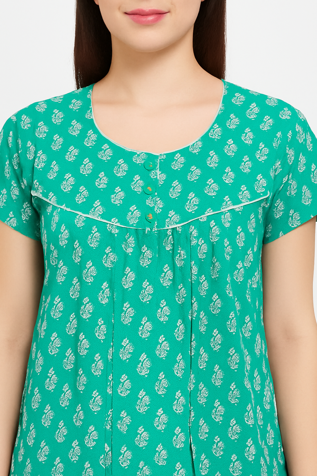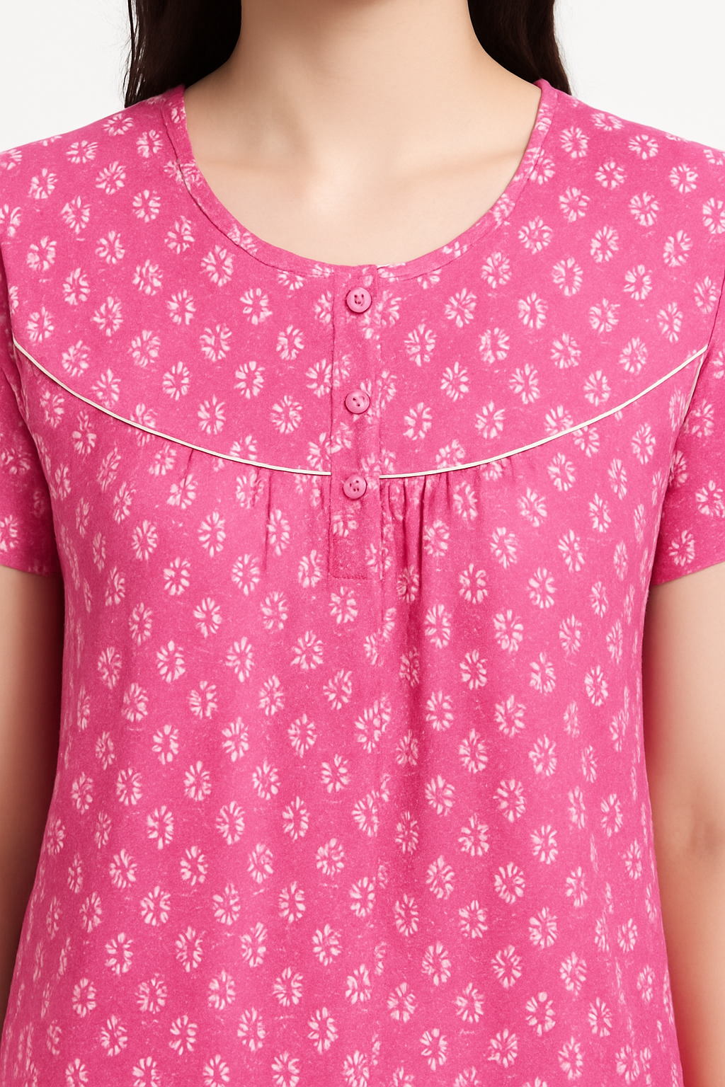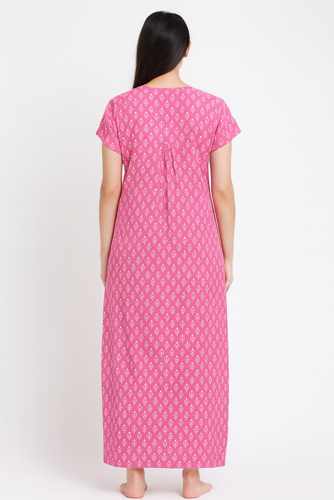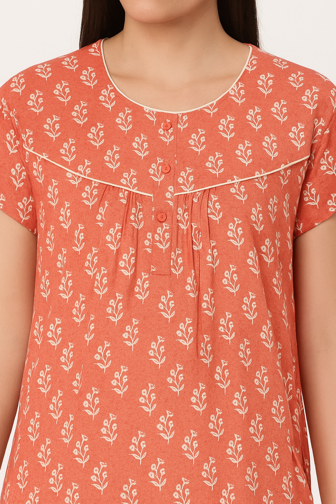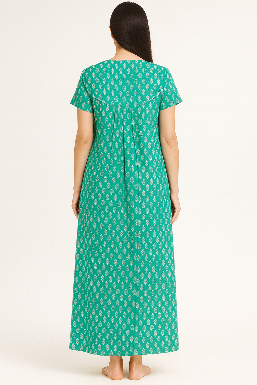 | The elegant U-neck design with neat contrast piping gives a modern and flattering look, while the front pleats add beautiful fall and shape. Featuring side pockets for convenience and a smooth A-line flow, this gown is perfect for home, leisure, and night wear. |